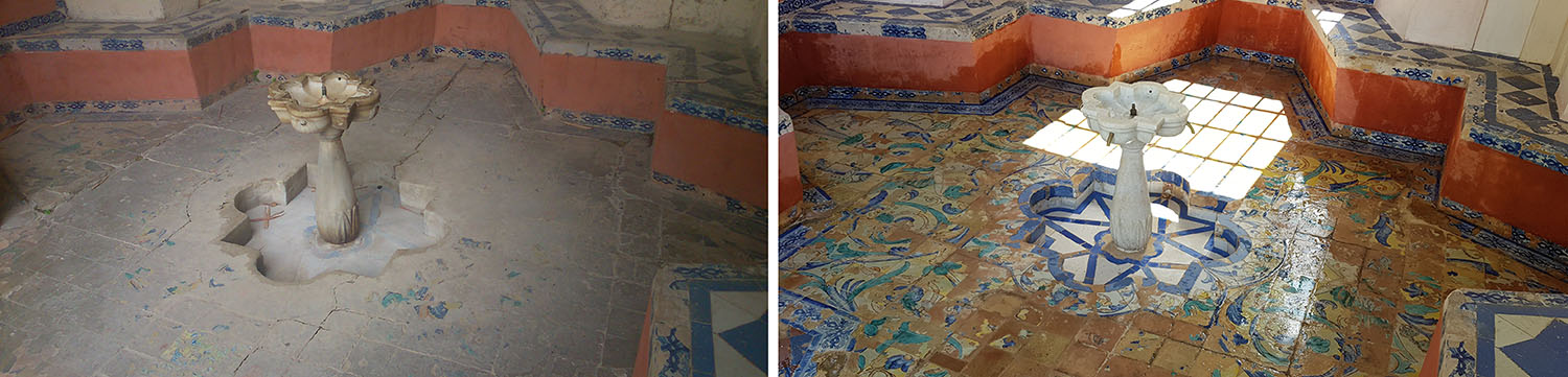 Se llevaron a cabo los trabajos de restauración de pinturas murales, eliminación de humedades en los muros, reparación de la cubierta, limpieza y recuperación de la fuente interior, restauración de las cerámicas en los bancos, y reparación de la fuente del león y de las filtraciones del estanque, de cuyos muros exteriores han salido a la luz pinturas murales medievales, de las que no se conocía su existencia y que parecen ser de la época de Pedro I. Se restauró el jardín adyacente y se reparó el riego de todo el conjunto. Por último, se instaló iluminación monumental.