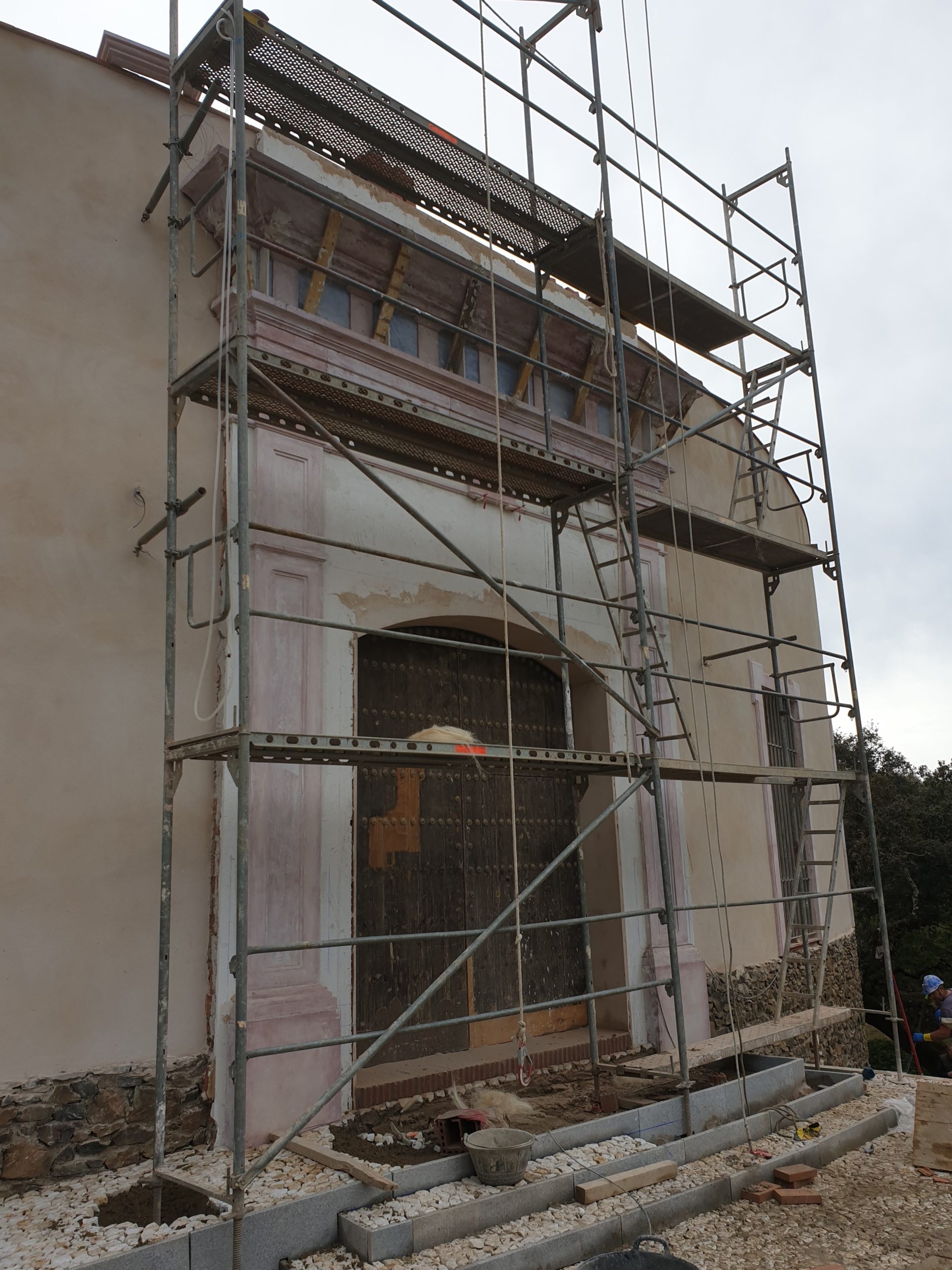 Se elaboran en taller las piezas prefabricadas de hormigón romano con aterrajados que componen la portada barroca. Posteriormente se trasladan y colocan in situ, para finalmente aplicar jabelga a la cal coloreada con pigmentos minerales.
