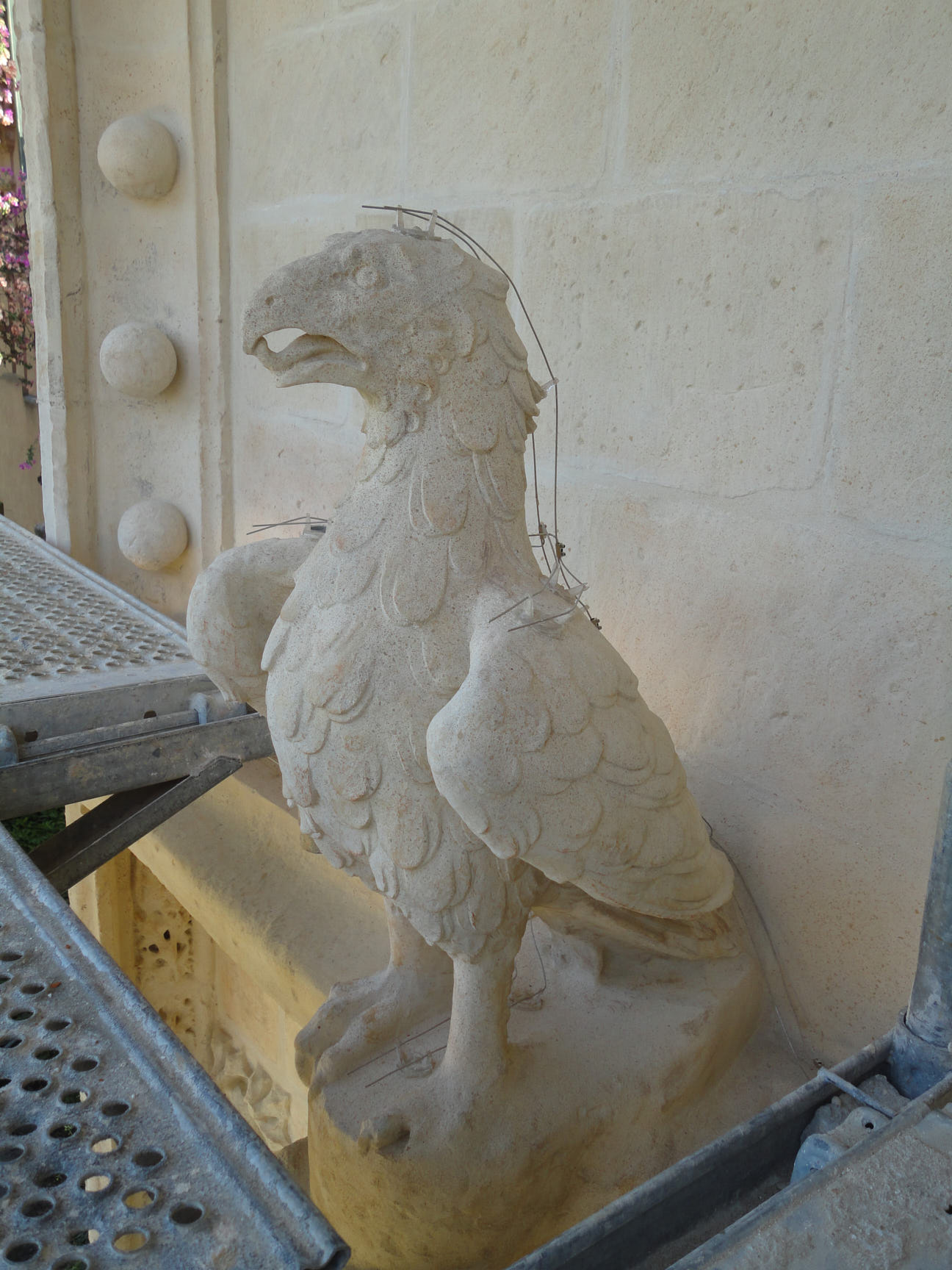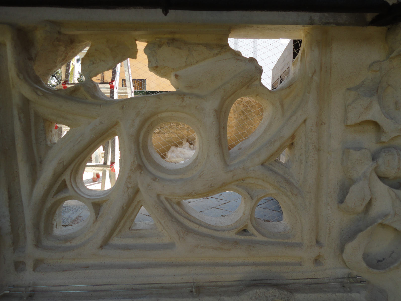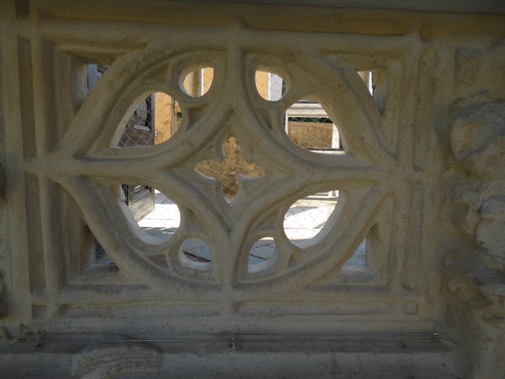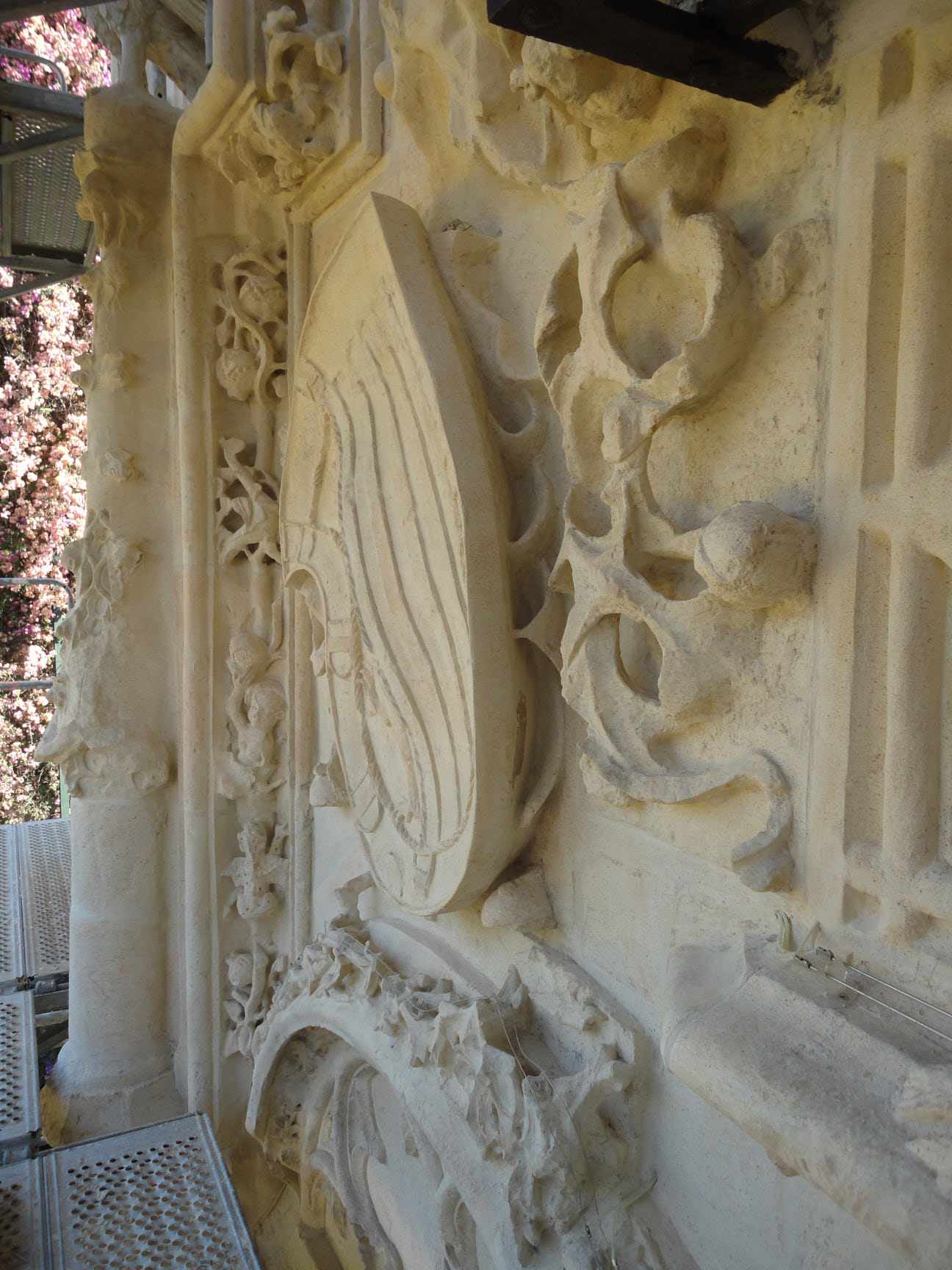 - Limpieza de la piedra, eliminando los materiales extraños y nocivos, sustituyéndolos por materiales originales, compatibles con la fábrica. A continuación, desalación de sulfatos, cloruros, algunos nitratos y carbonatos. Y limpieza de depósitos de partículas sedimentadas como el polvo atmosférico y excrementos de palomas.