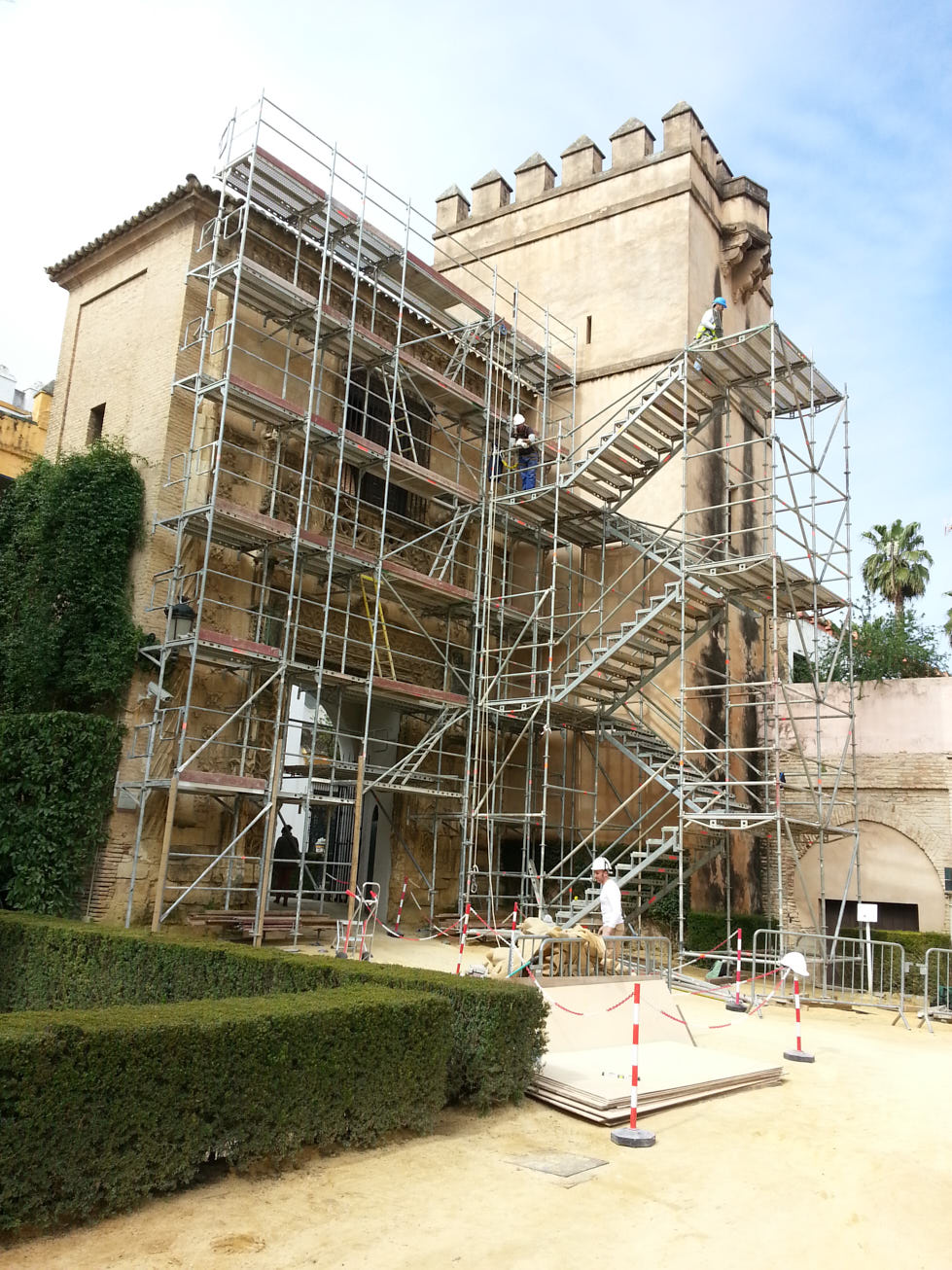 - Instalación de andamiaje y cubrición con paneles en la parte inferior y tela traslúcida, de color adecuado al entorno, como protección y acotado de la zona de trabajo.