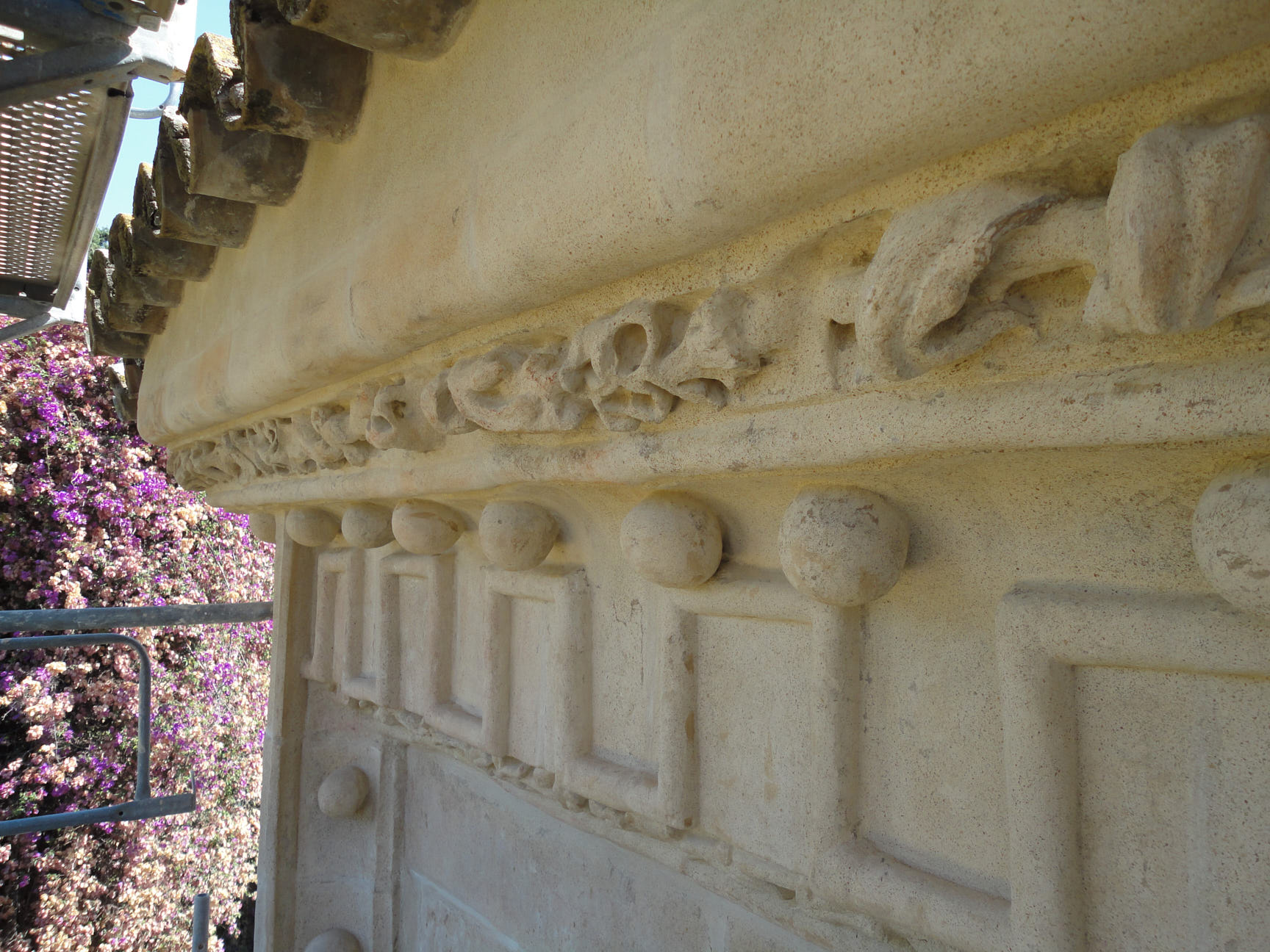 - Protección de la piedra con fina capa de mortero de cal, con materiales técnicamente controlados y compatibles con la piedra de la portada.